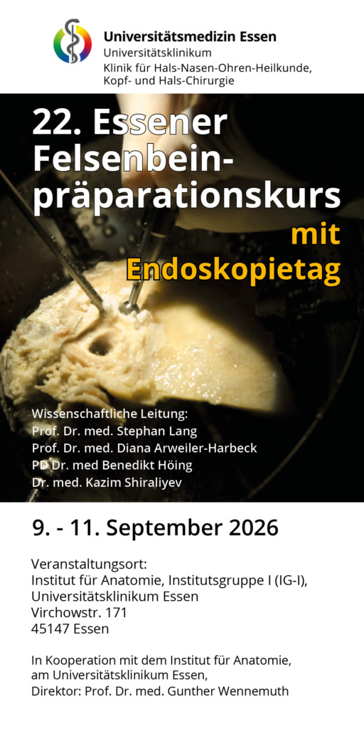 Zum zweiundzwanzigsten Essener Felsenbeinpräparationskurs der Universitätsklinik für Hals-Nasen-Ohren-Heilkunde Essen möchten wir Sie herzlich einladen.